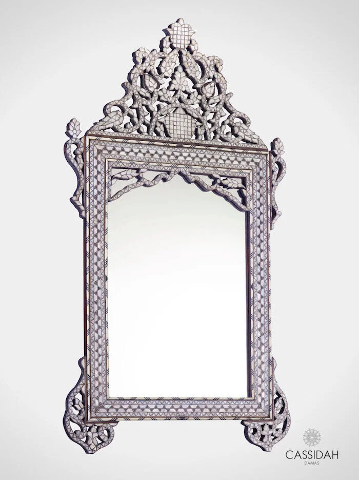 This mirror features a unique wooden frame inlayed with mother of pearl ,bone, pewter and wood. The crest is decorated with foliage, representing the old tradition of Damascene marquetry.